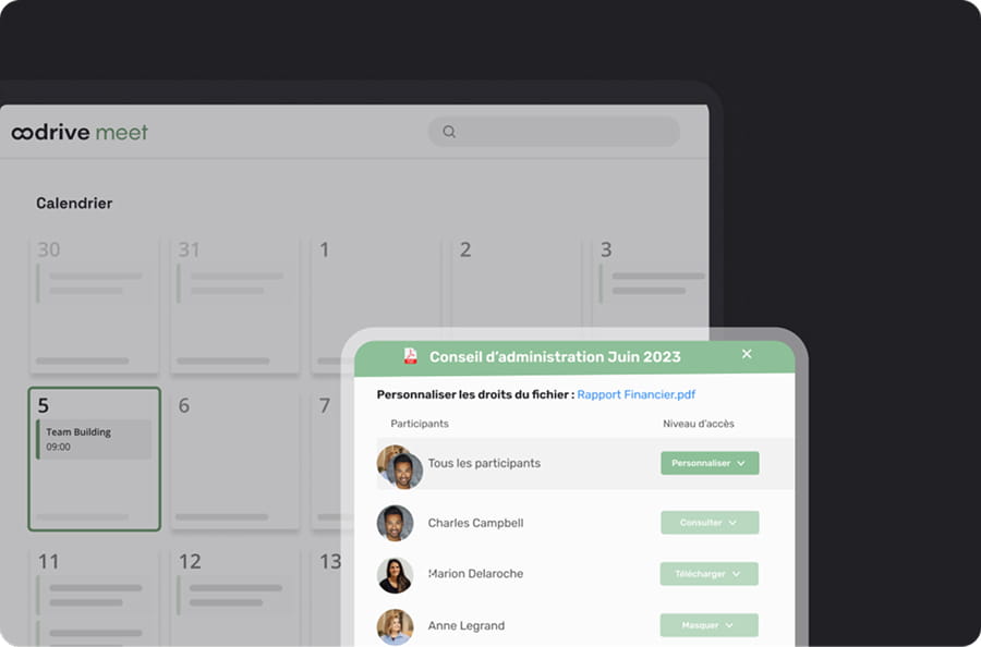 Retrouvez vos outils du quotidien directement intégrés à Oodrive Meet pour organiser, collaborer et signer en toute simplicité. Gagnez ainsi en fluidité, en souplesse et en sécurité à chaque étape de vos réunions sensibles.