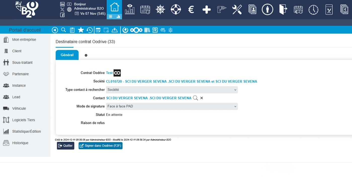 The document appears in Oodrive Sign with all recipients pre-filled. You can track the progress of each signature in real time: “pending,” “signed,” or “declined.” The status is automatically synchronized in myB2O.